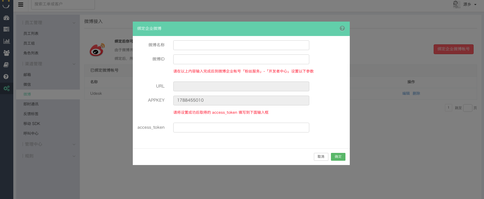 2.1 Administrator Log in to Udesk Platform and Navigate to 【Management Center - Weibo - Bind Enterprise Weibo Account】